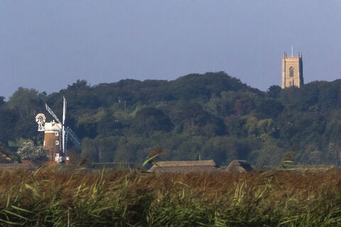 Cley marshes, with a windmill and church in the background, on a sunny day