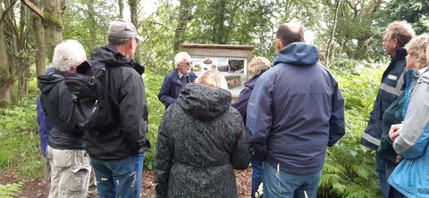 A group of people wearing waterproof coats on a guided walk at Hoe Common