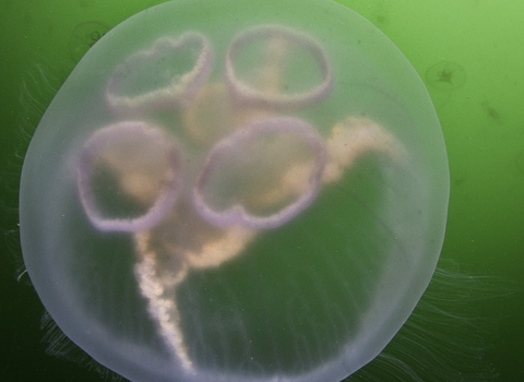 The moon jellyfish, or moon jelly, is found throughout the world's oceans. Around the size of a plate, it is recognisable by the four circles visible through the translucent white bell. These four circles are gonads, the reproductive organs located at the bottom of the stomach, and they are normally purple in colour. Moon jellies are common in UK seas and are often found washed up on shore. Jellyfish are 95% water and have no brain, blood or heart.
